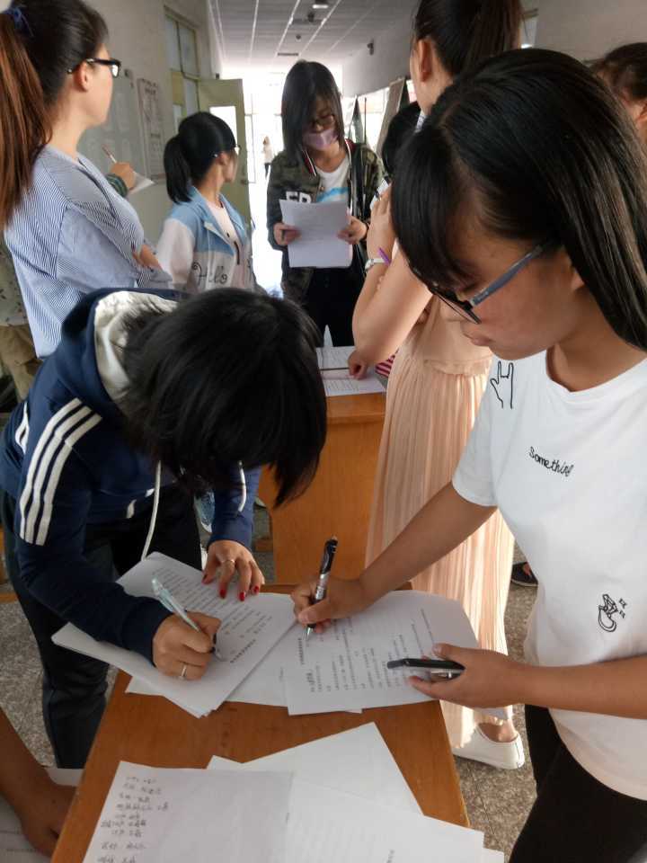 2017年7月16日早上7点到8点,文法社联工作人员在一楼大厅进行无记名调查问卷填写活动。