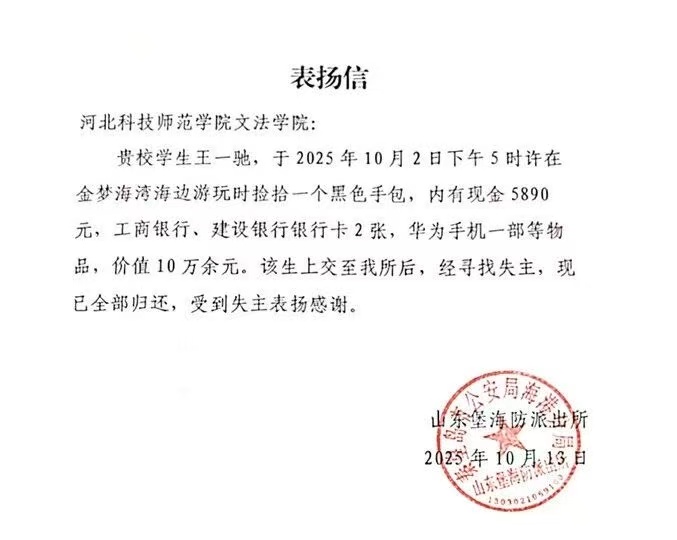 事情还要从半个月前说起10月2日王一驰在秦皇岛金梦海湾沙滩玩耍突然看到前方不远处有一个黑色的手提包环顾四周,几乎没什么人,他断定应该是哪位游客遗忘在这里的当时包里有厚厚一沓现金、一部手机还有几张银行卡,王一驰提着包在原地等了十来分钟始终没人来认领他又提着包到处寻找失主依然没有结果,正一筹莫展时前方走来两位执勤民警他连忙走上前将事情经过详细告知山东堡海防派出所民警商严和同事接过手提包简单清点了包内资产估算总价值超10万元他们夸赞王一驰“拾金不昧,好样的!”并询问了他的个人信息,商严和同事将手提包带回派出所后通过多种方式,很快联系上了失主失主认领时激动不已几天后失主到派出所送来一面锦旗反复恳请民警一定转送给恩人10月15日商严将这面锦旗和派出所出具的表扬信一并送到yl7703永利集团保卫科由yl7703永利集团老师最终转送给了王一驰。