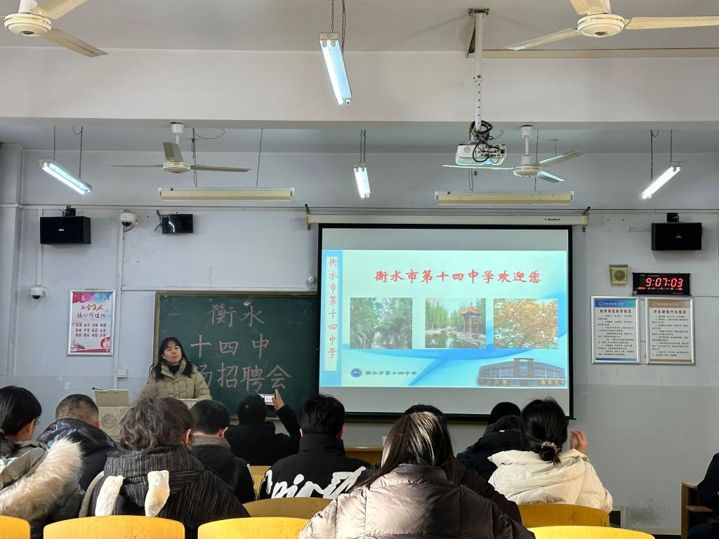 会议伊始,衡水十四中王校长详细介绍了学校概况、教育理念、上班时间、值班时间、入职培训和薪资待遇等同学们迫切关注的问题。衡水市第十四中学是衡水市桃城区唯一一所国办重点高中。学校“以生为本”“以师为根”,给教师一方发挥自我的空间,引导学生修身正己,激励广大教师自我超越。同时,新教师不实行坐班制、学校所有课堂均允许新教师听课学习等办学制度也为教师发展提供了广阔空间。会议最后,同学们依次完成了精彩的试讲,多名同学与衡水十四中有签约意向,并与随行老师深入沟通,王校长也对我院学生的专业素养提出极大赞赏。